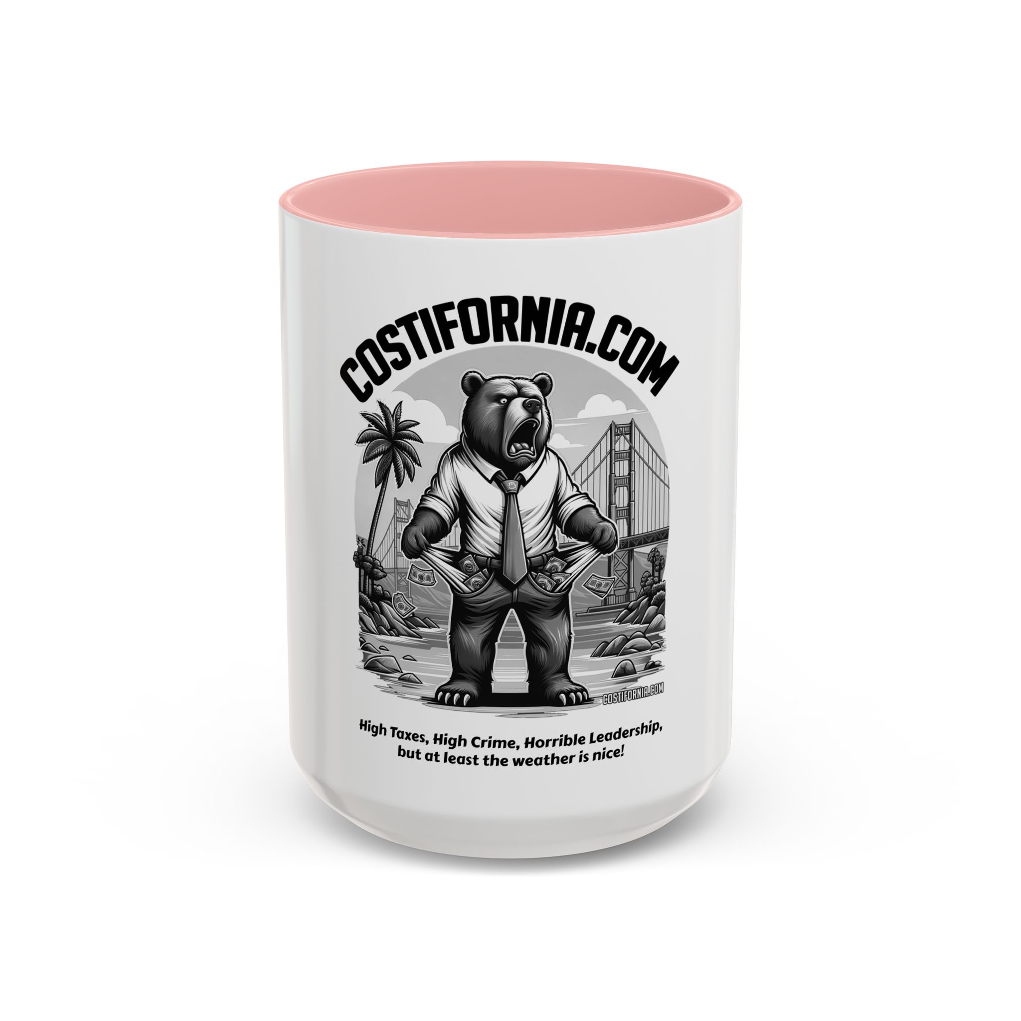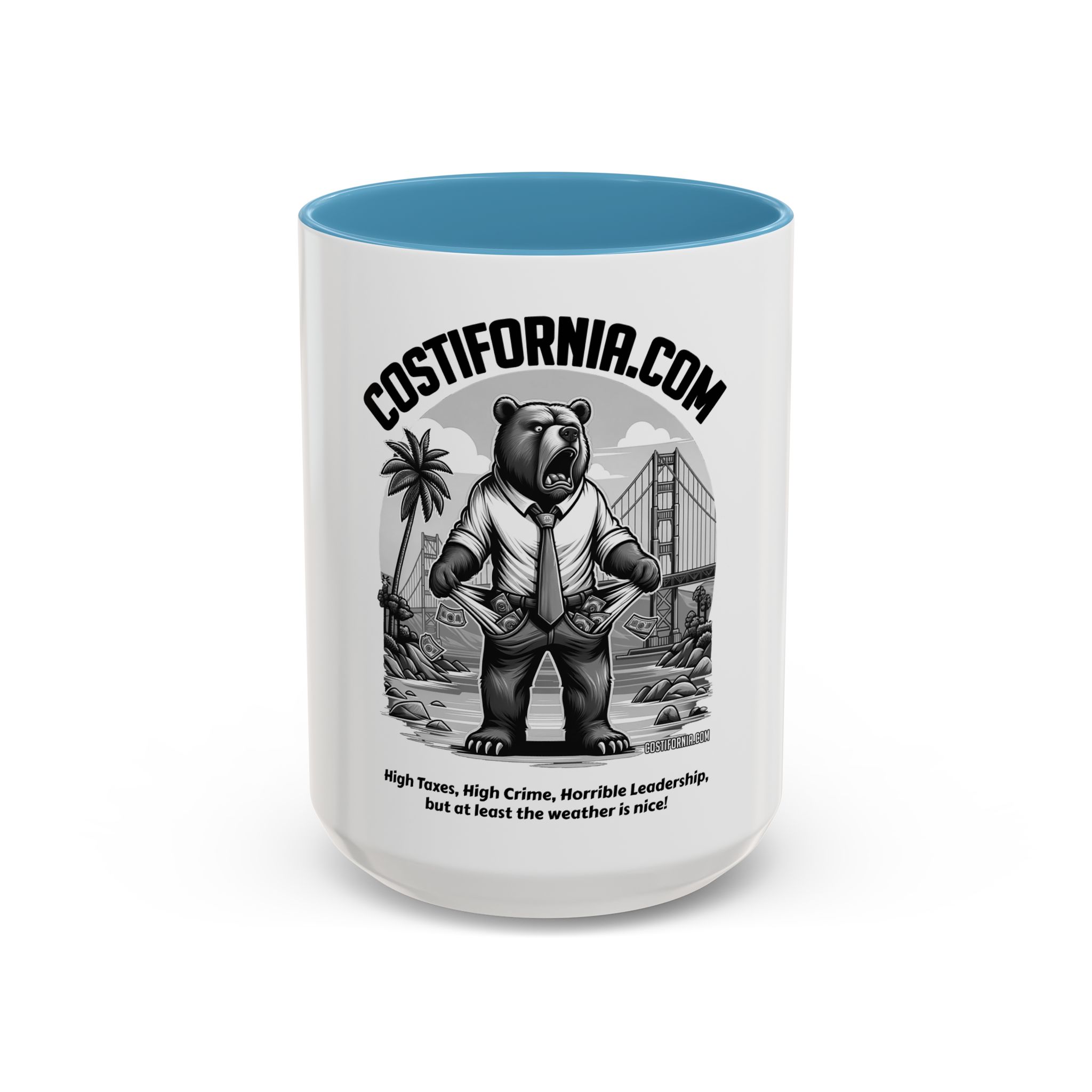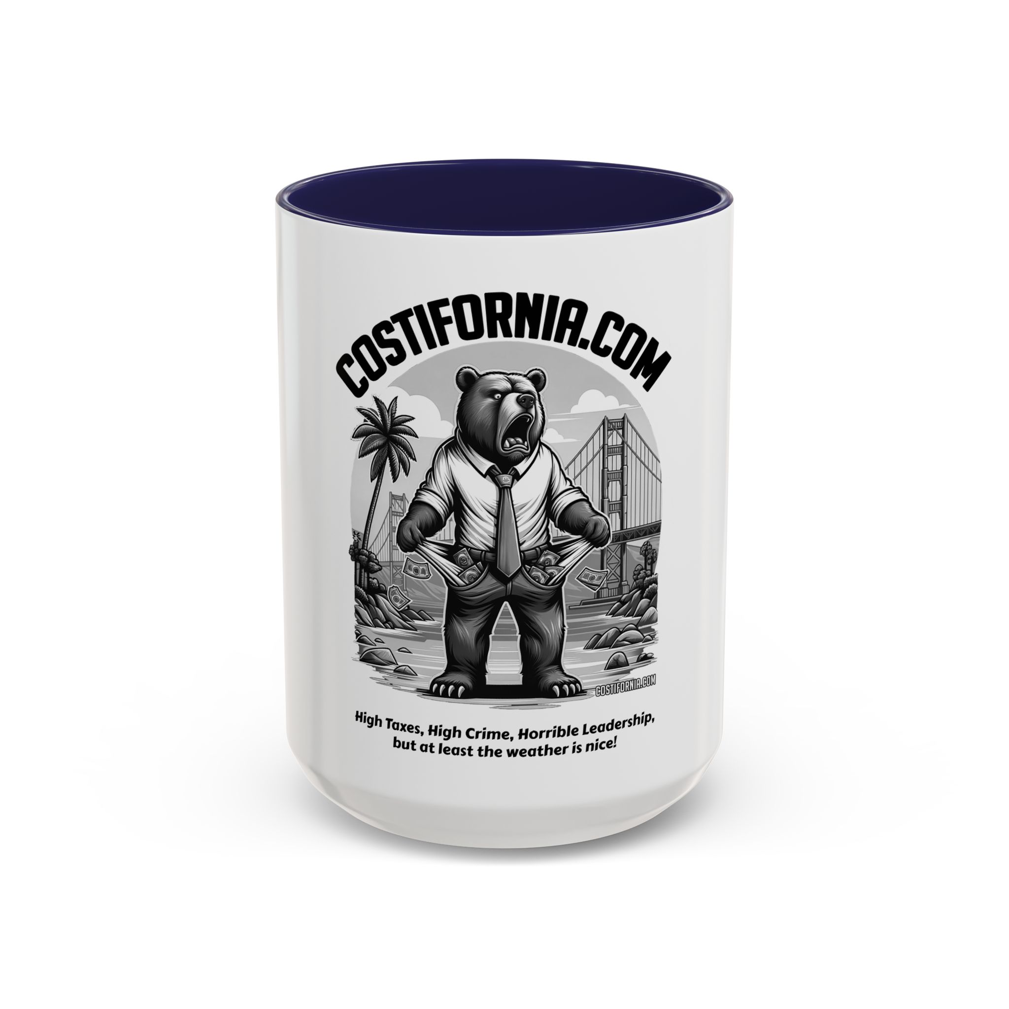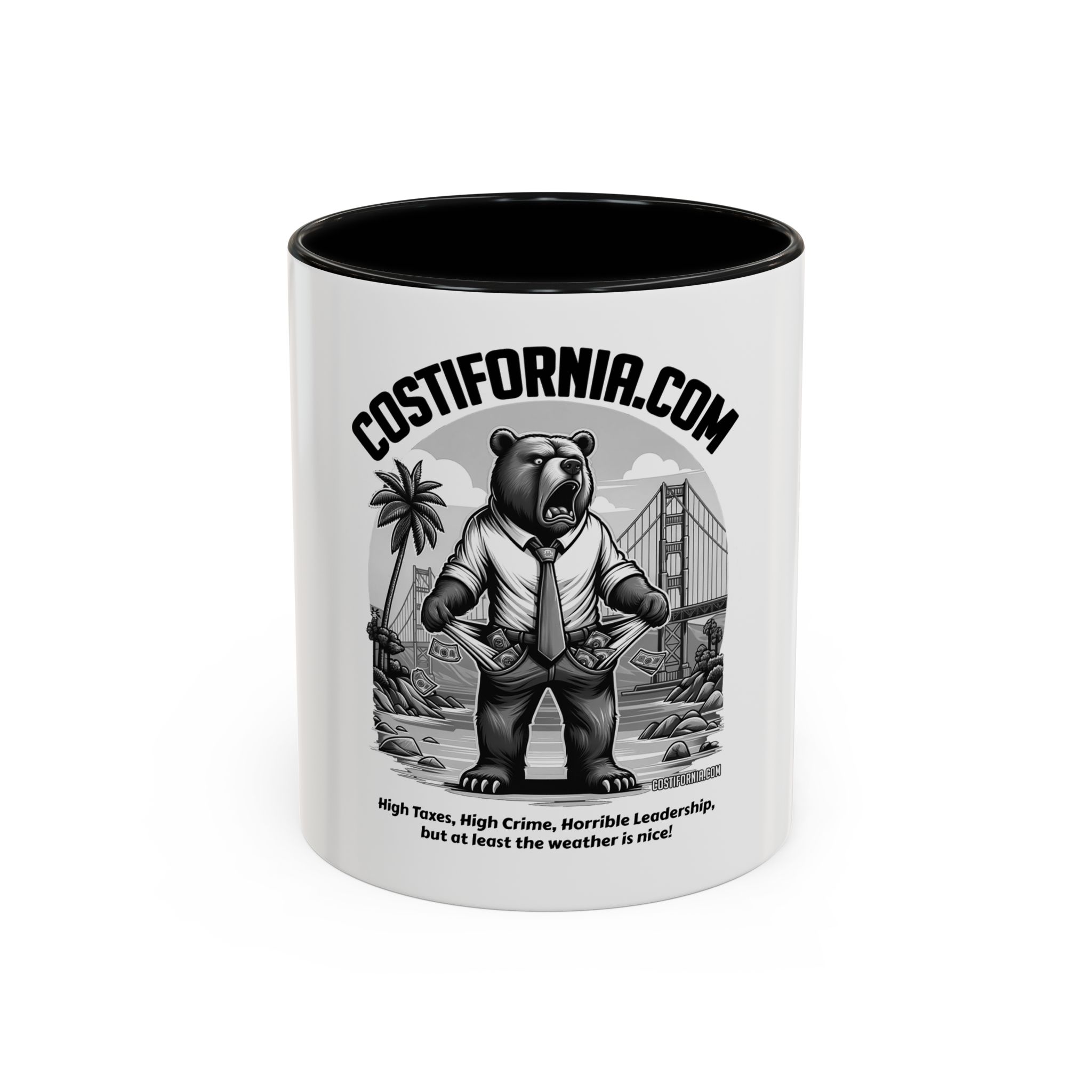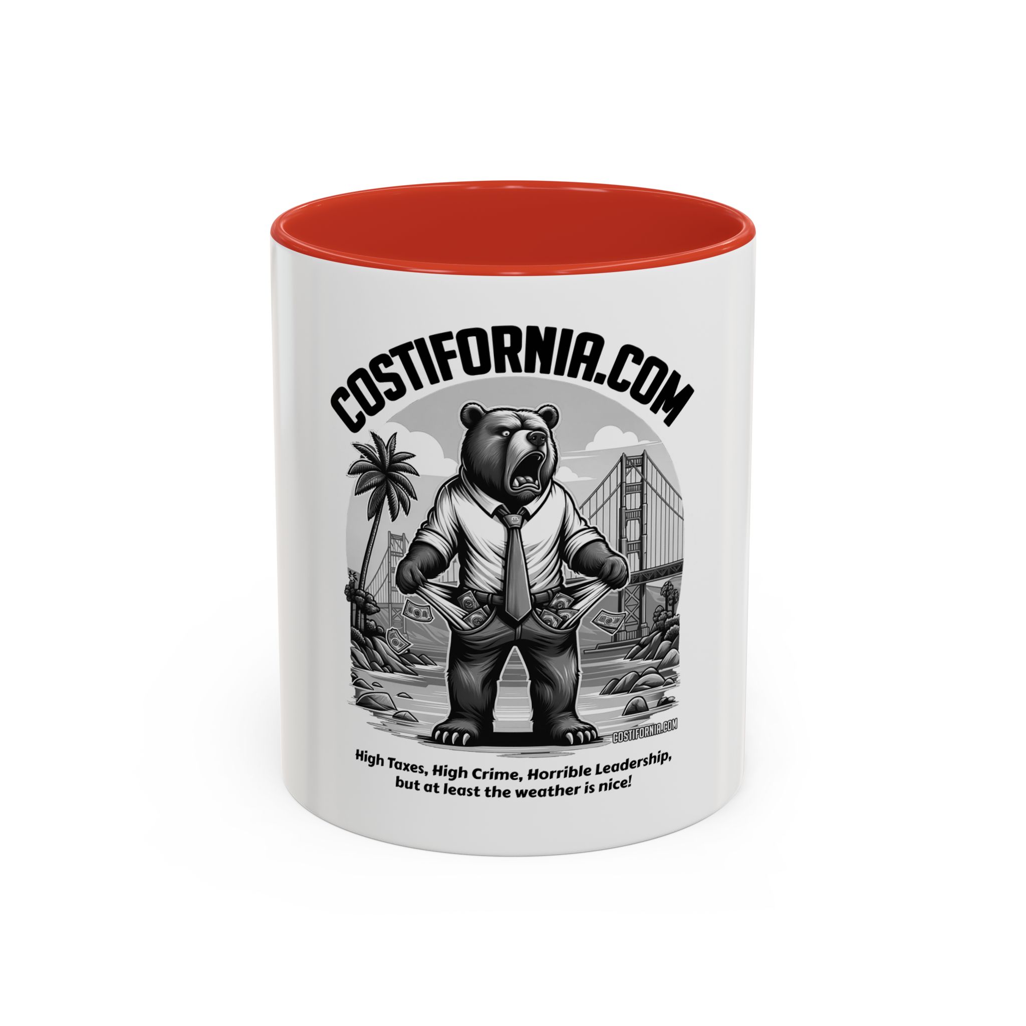 This Costifornia Brand Accent Mug showcases a design representing how expensive living costs are in California. The vibrant colors and eye-catching color contrast make it a stylish addition to your morning routine. Perfect for Californians or anyone familiar with the high cost of living in the golden state. Ideal for gifting during birthdays, holidays, or housewarming parties.